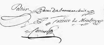 Montieu a été anobli par la fonction de Secrétaire du Roi, Maison, Couronne de France, et de ses finances en 1772[Notes 2].