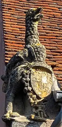 Acrotère sur la façade d'une maison de Châteaumeillant : grue portant les armes de Jean d'Albret
