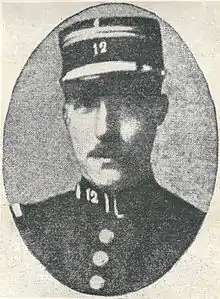 En 1912, il est sous-lieutenant, affecté au 12e dragons à Pont-à-Mousson puis sur le front[6],[2]. Il est blessé une première fois le [2] par un éclat d'obus[3] au cours d'une reconnaissance. Le , il est blessé d'un coup de lance[2],[3] d'un uhlan bavarois en chargeant à la tête de son peloton de dragons, puis rapatrié à Montauville. Affaibli par sa blessure, obligé de se cacher dans la cave d'une maison occupée par les Allemands, à Pont-à-Mousson, il est sauvé de la capture par un officier du 5e régiment de hussards en mission de reconnaissance, le sous-lieutenant Schmeltz.