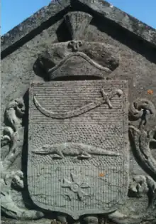 Tiercé en fasce d'azur, d'or et de gueules ; l'azur au sabre en fasce d'argent, l'or au crocodile de sinople, le gueules au signe des chevaliers légionnaires[6] - Livrées : les couleurs de l'écu, le verd en bordure seulement. |