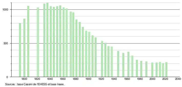 L'évolution du nombre d'habitants est connue à travers les recensements de la population effectués dans la commune depuis 1793. Pour les communes de moins de 10 000 habitants, une enquête de recensement portant sur toute la population est réalisée tous les cinq ans, les populations légales des années intermédiaires étant quant à elles estimées par interpolation ou extrapolation[22]. Pour la commune, le premier recensement exhaustif entrant dans le cadre du nouveau dispositif a été réalisé en 2006[23].