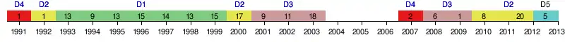 | 1993 | 1re | 13e | 30 | 34 | 10 | 10 | 14 | 52 | 62 | -10 | Cinquième tour |