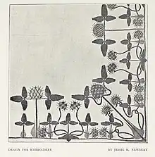 Newbery se distingue pour ses motifs de broderie très différents de ceux de la Royal School of Art Needlework. Ses créations présentent des formes florales avec des tiges anguleuses et une forte qualité décorative. Elle a également introduit le nouveau lettrage de style Glasgow dans ses motifs de broderie[6].
