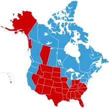 vote populaire lors de l'élection fédérale canadienne de 2006, par province et territoire. À l'opposé de la convention américaine récente, le schéma bleu/rouge est inversé.