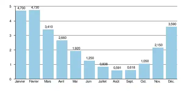 Le débit journalier maximal est de 28,30 m3/s (valeur mesurée le ) et la hauteur maximale instantanée de 203 cm le [note 3]. Le débit instantané maximal a été de 46,60 m3/s le [2].