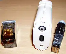 - abandonné à cause de sa mauvaise qualité. Son principe résidait en des micro-valves commandées électroniquement qui permettaient ou non l'éjection de l'encre. Son application était essentiellement industrielle, pour imprimer de gros caractères. L'avantage était que le fait d'avoir un réservoir fermé permettait d'utiliser des solvants volatils et autorisait donc un séchage plus rapide.