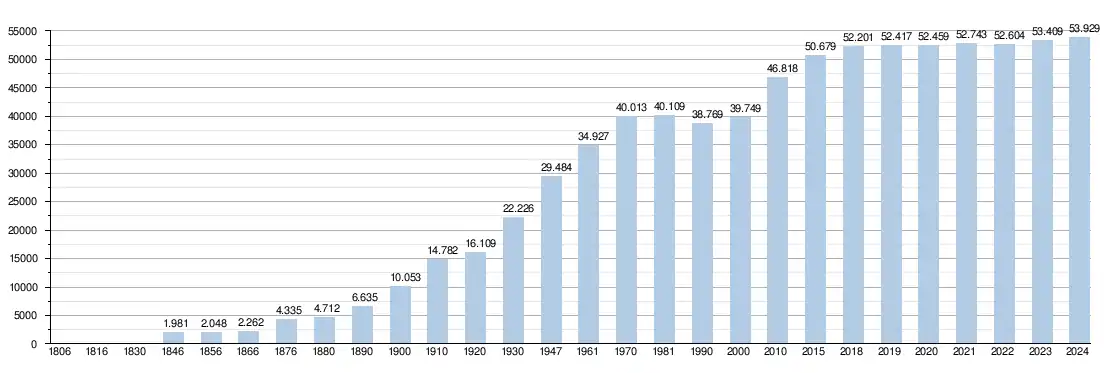 | Habitants | 39.749 | 46.818 | 50.679 | 52.201 | 52.417 | 52.459 | 52.743 | 52.604 | 53.409 | 53.929 | |||||||||||||||||||