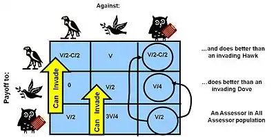 De même, en utilisant les inégalités, on peut montrer qu'un mutant supplémentaire de Faucon ou de Colombe entrant dans cet état de l'ESS finit par être moins adapté à son espèce – à la fois un véritable équilibre de Nash et un équilibre de l'ESS. Cet exemple montre que lorsque les risques de blessure ou de décès en compétition (représentés par le coût C) sont nettement supérieurs à la récompense potentielle (représentée par la valeur de bénéfice V), la population stable sera mélangée entre les agresseurs et les Colombes, et la proportion de Colombes dépassera celle des agresseurs. Cela explique les comportements observés dans la nature.