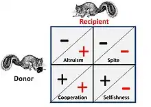 - Dans une relation altruiste, le donneur, fournit un avantage au receveur, avec un coût pour lui-même. Dans le cas général, le receveur aura un lien de parenté avec le donneur et le don est à sens unique. Les comportements où les bénéfices sont donnés alternativement (dans les deux sens) à un coût, sont souvent qualifiés d'altruistes, mais à l'analyse, un tel "altruisme" peut être considéré comme découlant de stratégies "égoïstes" optimisées.