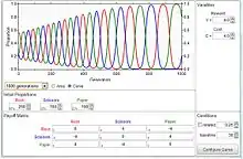 La façon habituelle d'étudier la dynamique de l'évolution dans les jeux est d'utiliser des équations de réplicateurs. Elles montrent le taux de croissance de la proportion d'organismes utilisant une certaine stratégie et ce taux est égal à la différence entre le gain moyen de cette stratégie et le gain moyen de la population dans son ensemble[12]. Les équations de réplicateurs continus supposent des populations infinies, un temps continu, un mélange complet et que les stratégies se reproduisent. Les attracteurs (points fixes stables) des équations sont équivalents à des états stables sur le plan de l'évolution. Une stratégie qui peut survivre à toutes les stratégies "mutantes" est considérée comme stable sur le plan de l'évolution. Dans le contexte du comportement animal, cela signifie généralement que ces stratégies sont programmées et fortement influencées par la génétique, rendant ainsi la stratégie de tout acteur ou organisme déterminée par ces facteurs biologiques[13],[14].