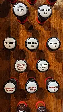 Mixture, Cimball, Compensation Mixture, Dolcan Mixture, Dolce Mixture, Full Mixture, Furniture, Gemshorn Mixture, Grand Chorus, Grand Mixture, Grave Mixture, Gross Mixture, Harmonic Cymbal, Harmonic Mixture, Harmonic Plein Jeu, Major Mixture, Octave Mixture, Pedal String Mixture, Plein Jeu, Principal Mixture, Septième Mixture, Sharp, Sharp Mixture, Sharp Twentieth, Stentor Mixture, Tierce Mixture