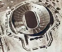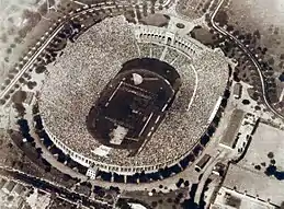 Le stade olympique de Pasadena en 1932 (86 000 spectateurs, avec autour du terrain la piste cyclable à virages relevés).