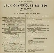Programme des épreuves des Jeux olympiques de 1896. Les finales sont indiquées par l'abréviation « f. ». Deux épreuves sont indiquées par leur spécificité : « maîtres », l'épreuve de fleuret ouverte aux professionnels ; « marins » le 100 m nage libre réservé aux marins.