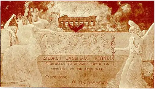 Lors du congrès olympique de 1894, un idéal internationaliste est mis en avant pour se placer dans l'héritage des Lumières et de la volonté de redécouverte de la Grèce antique. Le projet étant à l'origine strictement français, ceci permet d'occulter le contexte d'exacerbation des nationalismes en cette fin de XIXe siècle[44]. Un temps seulement car la question nationale embrasse l'organisation de ces Jeux notamment dans le pays organisateur. La période suivant la naissance de l'État grec en 1830 après la Guerre d'indépendance souligne les relations conflictuelles avec l'Empire ottoman. De même, les divisions entre le pouvoir royal et le peuple se font nombreuses. Toute politique nationale est alors orientée vers l'unification du peuple grec au sein d'un même territoire et donc, en opposition aux Turcs, vers l'agrandissement du territoire par le conflit armé ; c'est la Grande Idée. Pour les nationalistes grecs, l'organisation des premiers Jeux olympiques modernes permet de renforcer le lien avec l'Europe occidentale où l'opinion philhellène est très diffuse. Mais plus encore, le rendez-vous olympique permet d'exacerber le sentiment national qui se manifeste lors de la victoire du Grec Spyrídon Loúis lors du marathon.