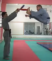 Technique de canne introduite par Ji Han-jae alors qu'il était blessé à la jambe, qu'il exécute ici sur GM Nicolas Tacchi.