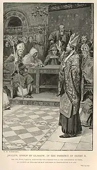 Jocelin ne se soumit ni à l'autorité de Roger de Pont L'Evêque, archevêque d'York, ni même à celle de Richard de Douvres, Archevêque de Cantorbéry : il réussit à obtenir une bulle papale, faisant de l'évêché de Glasgow une « fille particulière » du patriarcat[23],[24]. Jocelin semble ne s'être intéressé qu'au maintien de l'indépendance de son propre évêché, et pas particulièrement à celle des autres évêchés d'Écosse. Le , avec d'autres magnats (membres de la grande noblesse) et prélats, Jocelin se rendit à la cour du roi Henri pour se soumettre à son autorité, comme stipulé dans le traité. Cependant, cela ne se fit pas de manière complète et ainsi, avec cinq autres évêques, la question de l'assujettissement à l'Église d'Angleterre fut reportée[25]. Jocelin retourna à la cour en pour les affaires de l'Église : lorsque l'archevêque d'York fit face à Jocelin, demandant la soumission de l'évêché de Glasgow à l'archevêché d'York, celui-ci refusa de reconnaître cette part du traité et produisit la bulle papale déclarant Glasgow « fille particulière » de l'Église[26].