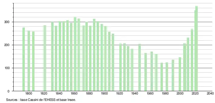 L'évolution du nombre d'habitants est connue à travers les recensements de la population effectués dans la commune depuis 1793. Pour les communes de moins de 10 000 habitants, une enquête de recensement portant sur toute la population est réalisée tous les cinq ans, les populations légales des années intermédiaires étant quant à elles estimées par interpolation ou extrapolation[32]. Pour la commune, le premier recensement exhaustif entrant dans le cadre du nouveau dispositif a été réalisé en 2005[33].