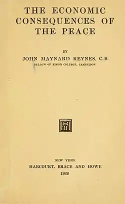 Pour exprimer ses idées et ses réserves envers le traité de Versailles, il écrit en 1919 Les Conséquences économiques de la paix. Ce livre lui apporte à la fois l’aisance financière et une notoriété internationale. Il y reproche moins à Georges Clemenceau d’avoir défendu et imposé une solution influencée par le réalisme en relations internationales qu’à Woodrow Wilson et à Lloyd George de ne pas avoir défendu plus fermement leurs idées proches du libéralisme en relations internationales plus favorables à la paix et au développement économique. En conséquence, c'est à ces derniers qu'il réserve ses flèches les plus acérées. Ce livre passe mal en France[Note 6]. Dès 1920, Jacques Bainville lui répond dans Les Conséquences politiques de la paix, ouvrage prémonitoire où Bainville décrit l'enchaînement historique qui conduira à la seconde guerre mondiale et où il déplore l'approche purement économique de Keynes. En 1946, Étienne Mantoux fera paraître un livre destiné à réfuter les thèses de Keynes : The Carthaginian Peace or the Economic Conséquences of Mr. Keynes. Pour l'économiste historien américain Charles Kindleberger[Note 7] l'ouvrage de Keynes a heurté le sentiment national français, et cela expliquerait en partie pourquoi les économistes français ne s'intéressèrent vraiment à l'œuvre de Keynes qu'après la Seconde Guerre mondiale.