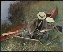 Sargent passe beaucoup de temps à arpenter et à peindre la campagne anglaise, lorsqu'il ne travaille pas dans son atelier. Lors d'une visite chez Claude Monet à Giverny en 1885, Sargent peint l'un de ses portraits les plus impressionnistes, qui représente Monet peignant en plein air, en compagnie de sa nouvelle épouse. Sargent n'est cependant pas considéré comme un peintre impressionniste, mais il en utilise parfois les techniques, avec talent, et son Claude Monet Painting at the Edge of a Wood est sans doute sa vision personnelle de ce style. Dans les années 1880, il participe à des expositions impressionnistes et commence à peindre en plein air après sa visite à Monet. Il achète, à cette époque, pour sa collection personnelle, quatre toiles de Monet[44]. Suivant la même inspiration, il avait réalisé un portrait de son ami Paul Helleu, peignant également en extérieur avec sa femme à ses côtés. Une photographie très similaire à sa peinture suggère que Sargent utilisait à l'occasion la photographie pour ses compositions[45]. Grâce à Helleu, Sargent rencontre et fait un portrait de Rodin en 1884, qui est au sommet de la gloire. C'est un portrait plutôt sombre, rappelant l'œuvre de Thomas Eakins[46]. En 1885, il succède à Boldini dans son atelier du no 41 boulevard Berthier à Paris[réf. nécessaire].