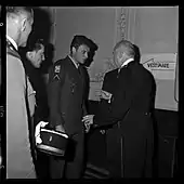 Il donne encore quelques galas en province, à l'issue desquels il est incorporé, le , au 43e régiment d'infanterie de marine d'Offenbourg (le chanteur a bénéficié d'un report d'une année afin de pouvoir honorer tous ses engagements). Enregistré avant son incorporation, sort début juillet l'album Johnny, reviens ! Les Rocks les plus terribles. L'opus entièrement rock'n'roll, propose des adaptations de standards américains[96]. L'armée profite du passage dans ses rangs pour quinze mois de la célèbre recrue pour tourner des petits films de propagande à l'attention de la jeunesse, ainsi que quelques émissions de variétés réalisées en direct de la caserne[alpha 16] et, à la condition qu'il pose en tenue militaire sur les pochettes de disques, il obtient l'autorisation de poursuivre ses enregistrements. C'est durant cette période qu'il grave l'un de ses plus grands succès, Le Pénitencier, extrait du 25 cm éponyme.