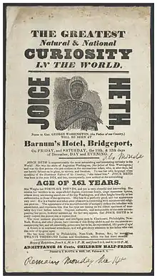Elle est vers la fin de sa vie aveugle et presque complètement paralysée (elle pouvait cependant parler, et arrivait à déplacer son bras droit)[4] lorsque Barnum a commencé à l'exhiber le , au Niblo's Garden, à New York, où des milliers de personnes se pressent pour la voir[5],[6],[3]. L'affiche publicitaire est une image brute de gravure sur bois représentant une femme au visage ratatiné et aux ongles en forme de serre[7]. Elle la présente comme étant une esclave née sur l'île de Madagascar, sur la côte de l'Afrique, en l'an 1674 et par conséquent âgée de 161 ans[8]. Elle comporte les lignes suivantes : « Joice Heth est sans aucun doute la plus étonnante et intéressante curiosité du Monde ! Elle est l'esclave d'Augustine Washington, (le père de George Washington), et a été la première personne à mettre des vêtements sur l'enfant encore inconscient, qui, après des jours et des jours, a conduit nos héroïques pères à la gloire, à la victoire et à la liberté. Pour utiliser ses propres dires, quand elle parle de l'illustre Père de ce Pays, « elle l'a élevé »[9]. »