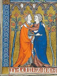 David, le plus jeune fils de Jessé, possédant « de beaux yeux et bonne apparence[1] », fut élevé auprès de Saül, roi d'Israël, et terrassa Goliath, le guerrier géant des Philistins, avec une seule pierre lancée d'une fronde[2]. Jonathan, l'aîné de Saül, fut immédiatement sous le charme dès leur première rencontre : « Or il advint, dès que David eut achevé de parler à Saül, que l'âme de Jonathan se lia à l'âme de David et que Jonathan l'aima comme lui-même[3]. » Ce même jour, « Jonathan conclut une alliance avec David, parce qu'il l'aimait comme lui-même[4] » ; alors « [il] se dépouilla du manteau qu'il avait sur lui et il le donna à David, ainsi que ses effets et jusqu'à son épée, son casque et sa ceinture[5]. »