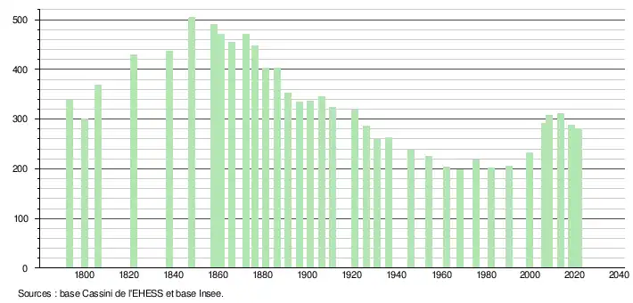 L'évolution du nombre d'habitants est connue à travers les recensements de la population effectués dans la commune depuis 1793. Pour les communes de moins de 10 000 habitants, une enquête de recensement portant sur toute la population est réalisée tous les cinq ans, les populations légales des années intermédiaires étant quant à elles estimées par interpolation ou extrapolation[16]. Pour la commune, le premier recensement exhaustif entrant dans le cadre du nouveau dispositif a été réalisé en 2008[17].