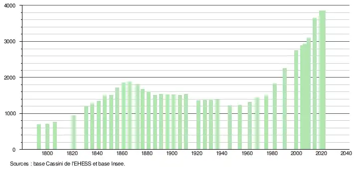 L'évolution du nombre d'habitants est connue à travers les recensements de la population effectués dans la commune depuis 1793. Pour les communes de moins de 10 000 habitants, une enquête de recensement portant sur toute la population est réalisée tous les cinq ans, les populations légales des années intermédiaires étant quant à elles estimées par interpolation ou extrapolation[27]. Pour la commune, le premier recensement exhaustif entrant dans le cadre du nouveau dispositif a été réalisé en 2004[28].