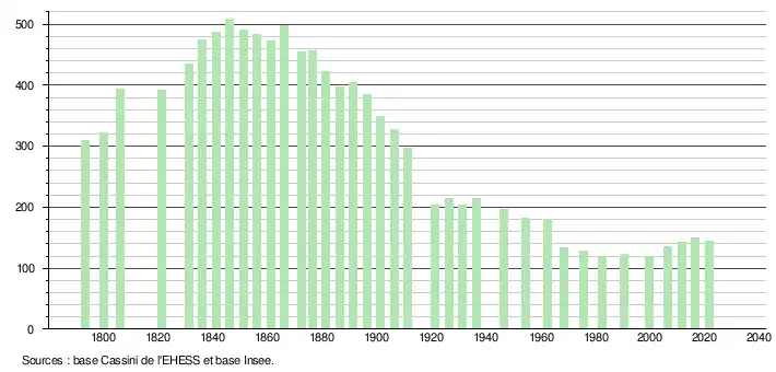 L'évolution du nombre d'habitants est connue à travers les recensements de la population effectués dans la commune depuis 1793. Pour les communes de moins de 10 000 habitants, une enquête de recensement portant sur toute la population est réalisée tous les cinq ans, les populations légales des années intermédiaires étant quant à elles estimées par interpolation ou extrapolation[16]. Pour la commune, le premier recensement exhaustif entrant dans le cadre du nouveau dispositif a été réalisé en 2006[17].
