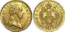 Ducat d'or à l'effigie de Joseph II, 1787 : IOS. II D.G.R.I.S.A. (« Iosephus II Dei Gratia Romanorum Imperator Semper Augustus ») (trad. : « Joseph II par la grâce de Dieu Empereur des Romains toujours auguste »).