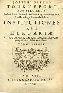 - Joseph Pitton de Tournefort, Josephi Pitton Tournefort,... Institutiones rei herbariae. Tomus 1, Typographia regiaTypographia regia (Parisiis), 1700-1703 (lire en ligne)
