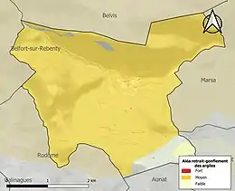 Le retrait-gonflement des sols argileux est susceptible d'engendrer des dommages importants aux bâtiments en cas d’alternance de périodes de sécheresse et de pluie. 92,3 % de la superficie communale est en aléa moyen ou fort (75,2 % au niveau départemental et 48,5 % au niveau national). Sur les 68 bâtiments dénombrés sur la commune en 2019, 68 sont en aléa moyen ou fort, soit 100 %, à comparer aux 94 % au niveau départemental et 54 % au niveau national. Une cartographie de l'exposition du territoire national au retrait gonflement des sols argileux est disponible sur le site du BRGM[24],[Carte 3].