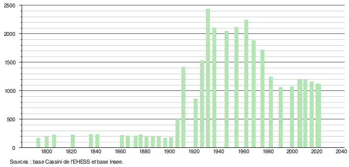L'évolution du nombre d'habitants est connue à travers les recensements de la population effectués dans la commune depuis 1793. Pour les communes de moins de 10 000 habitants, une enquête de recensement portant sur toute la population est réalisée tous les cinq ans, les populations légales des années intermédiaires étant quant à elles estimées par interpolation ou extrapolation[21]. Pour la commune, le premier recensement exhaustif entrant dans le cadre du nouveau dispositif a été réalisé en 2005[22].