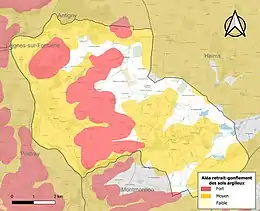 Les mouvements de terrains susceptibles de se produire sur la commune sont des tassements différentiels[17]. Le retrait-gonflement des sols argileux est susceptible d'engendrer des dommages importants aux bâtiments en cas d’alternance de périodes de sécheresse et de pluie[18]. 76,7 % de la superficie communale est en aléa moyen ou fort (79,5 % au niveau départemental et 48,5 % au niveau national)[Carte 2]. Depuis le , en application de la loi ÉLAN, différentes contraintes s'imposent aux vendeurs, maîtres d'ouvrages ou constructeurs de biens situés dans une zone classée en aléa moyen ou fort[Note 3],[19].