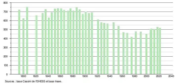 L'évolution du nombre d'habitants est connue à travers les recensements de la population effectués dans la commune depuis 1793. Pour les communes de moins de 10 000 habitants, une enquête de recensement portant sur toute la population est réalisée tous les cinq ans, les populations légales des années intermédiaires étant quant à elles estimées par interpolation ou extrapolation[24]. Pour la commune, le premier recensement exhaustif entrant dans le cadre du nouveau dispositif a été réalisé en 2007[25].