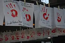 Affichettes de mains rouges signées par des membres et employés du Bundestag en 2012 pour la campagne de la main rouge.