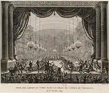 Orgie des gardes du corps dans la salle de l'opéra de Versailles - le , gravure datant de 1792.
