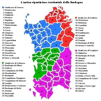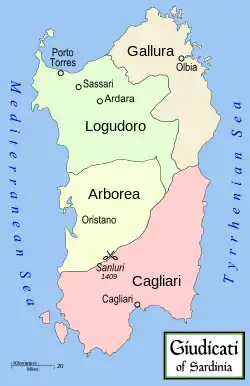 Les quatre Judicats sardes étaient Cagliari, Torres ou Logudoro, Arborée (ou Oristano) et Gallura. L'absence quasi totale de sources historiques ne permettent pas d'avoir une certitude sur le passage de l'autorité centrale byzantine à la naissance des quatre États. Toutefois dès 864, une lettre du pape Nicolas Ier demande aux Iudices d'éviter la consanguinité ; il est le premier témoin de l'existence d'une multiplicité de seigneurs locaux[2].