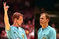 | 2 | Reprise de dribble | Geste explicatif, souvent consécutif au geste no 9, qui indique que le joueur a fait un dribble irrégulier ou s'est arrêté de dribbler puis reprend son dribble. L'arbitre, bras parallèles, fait un mouvement de ciseaux. |