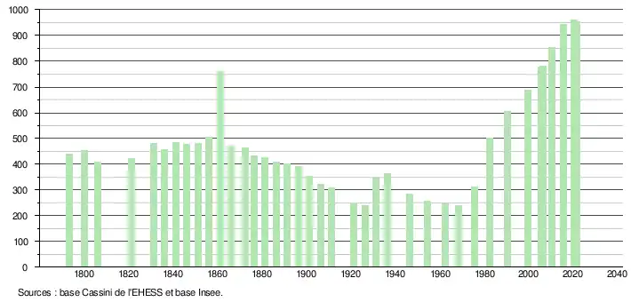 L'évolution du nombre d'habitants est connue à travers les recensements de la population effectués dans la commune depuis 1793. Pour les communes de moins de 10 000 habitants, une enquête de recensement portant sur toute la population est réalisée tous les cinq ans, les populations légales des années intermédiaires étant quant à elles estimées par interpolation ou extrapolation[29]. Pour la commune, le premier recensement exhaustif entrant dans le cadre du nouveau dispositif a été réalisé en 2005[30].