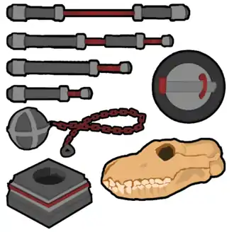 - Le crâne (allemand : jugg dans la tradition berlinoise, schädel dans la tradition d'Hamburg[11]) : une balle en mousse et non un vrai crâne de chien comme dans le film The Blood of Heroes. En Allemagne et en Irlande, il s'agit un crâne de chien en mousse cellulaire ou latex ; il existe également des crânes de compétition non sculptés, en forme de cône ou de cylindre ;