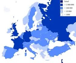 En 2013, la population juive européenne, environ 1 400 000 personnes, représente à peine plus d'un dixième de la population juive mondiale d'avant la Seconde Guerre mondiale. Les plus grandes communautés juives européennes se trouvent en France, au Royaume-Uni et en Russie.