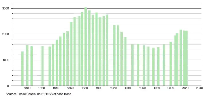 L'évolution du nombre d'habitants est connue à travers les recensements de la population effectués dans la commune depuis 1793. Pour les communes de moins de 10 000 habitants, une enquête de recensement portant sur toute la population est réalisée tous les cinq ans, les populations légales des années intermédiaires étant quant à elles estimées par interpolation ou extrapolation[24]. Pour la commune, le premier recensement exhaustif entrant dans le cadre du nouveau dispositif a été réalisé en 2008[25].