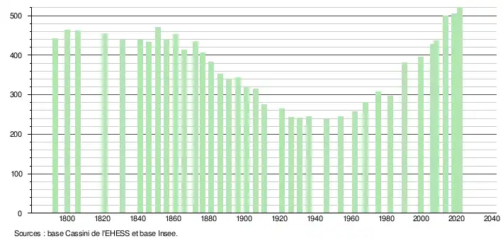 L'évolution du nombre d'habitants est connue à travers les recensements de la population effectués dans la commune depuis 1793. Pour les communes de moins de 10 000 habitants, une enquête de recensement portant sur toute la population est réalisée tous les cinq ans, les populations légales des années intermédiaires étant quant à elles estimées par interpolation ou extrapolation[28]. Pour la commune, le premier recensement exhaustif entrant dans le cadre du nouveau dispositif a été réalisé en 2008[29].