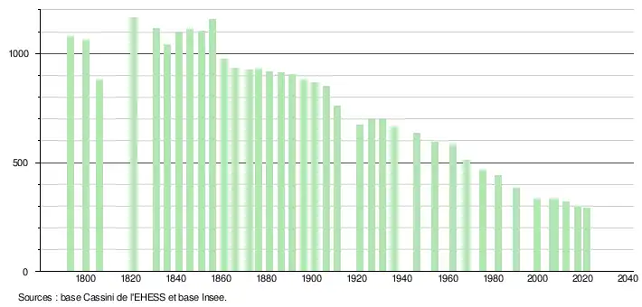 L'évolution du nombre d'habitants est connue à travers les recensements de la population effectués dans la commune depuis 1793. Pour les communes de moins de 10 000 habitants, une enquête de recensement portant sur toute la population est réalisée tous les cinq ans, les populations légales des années intermédiaires étant quant à elles estimées par interpolation ou extrapolation[12]. Pour la commune, le premier recensement exhaustif entrant dans le cadre du nouveau dispositif a été réalisé en 2007[13].