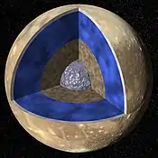 Surface extrêmement ancienne Mélange de glace et de roche mal différencié Océan subglaciaire entre deux couches de glace Pas de noyau métallique Radioactivité négligeable (0,01 rem/jour) |