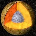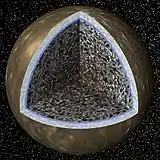 Surface ancienne Croûte de glace flottant sur un manteau de glace plus chaud Océan subglaciaire entre deux couches de glace Noyau métallique liquide Présence d'un champ magnétique Radioactivité élevée (8 rem/jour) |