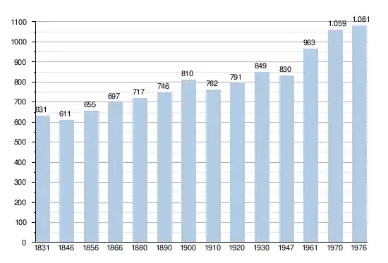 Les chiffres des années 1831 à 1970 tiennent compte des chiffres des anciennes communes fusionnées.