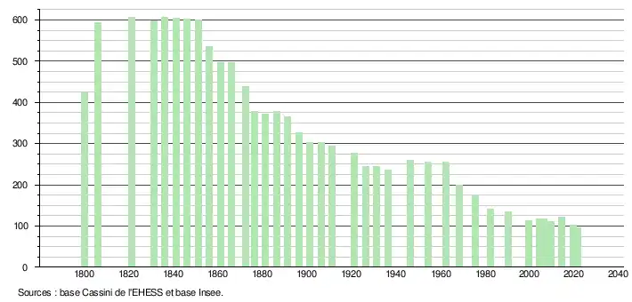 L'évolution du nombre d'habitants est connue à travers les recensements de la population effectués dans la commune depuis 1800. Pour les communes de moins de 10 000 habitants, une enquête de recensement portant sur toute la population est réalisée tous les cinq ans, les populations légales des années intermédiaires étant quant à elles estimées par interpolation ou extrapolation[29]. Pour la commune, le premier recensement exhaustif entrant dans le cadre du nouveau dispositif a été réalisé en 2004[30].