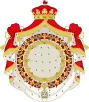 De gueules, à la bande d'or (de Noailles) ; au canton des comtes officiers de Notre Maison brochant.[7]